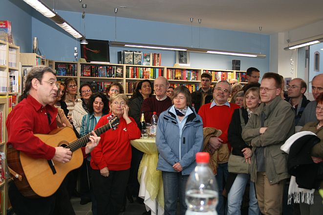 RIED-ECHO, 4.3.2008 GERNSHEIM. „Ein Dankeschön-Fest soll es werden, so begrüßte Lucia Bornhofen am Samstagnachmittag die über 80 Gäste, sie sich in ihrer neuen Buchhandlung in der Magdalenenstraße 55 eingefunden hatten. Ein Dankeschön für Kunden sowie für Freunde und Bekannte, das darüber hinaus eine Bühne für „Gernsheimer Kleinkunst“ bot. Mit „Ohrenschmaus und Sprachgenuss“ war diese Kulturveranstaltung überschrieben, die nicht nur das Stöbern im neuen Medienangebot ermöglichte, sondern auch für zwei Stunden Musik- und Sprachgenuss bot… Hans-Werner Brun hatte sich für eine Auswahl seiner amüsanten Lieder entschieden. Darin ging es unter anderem um das Gebbabel, wie es bei „Asterix und Obelix uf hessisch“ zu finden ist, er behauptete darüber hinaus „Nix Genaues waas mer net und wer es waas, werd’s wisse“ und lud mit „Hallo, pflück mich“ zum hemmungslosen Erdbeergenuss ein. Auch mit „Marco, de Genie“, der im Altenheim um das Wohlgefallen und die Schönheit der Heimbewohnerinnen bemüht ist, hatte er die Lacher auf seiner Seite… Da man in einer Buchhandlung von Wörtern geradezu umzingelt ist, bot Birgit Weinmann zu sprachwörtlichen Spielereien ein. Geflügelten Wörtern und Redewendungen ging sie auf den Grund – „saugte sich so manches aus den Fingern“, erklärte was mit „heuern und feuern“, „durch die Lappen gehen“ und „gelösten Zungen“ auf sich hatte…“ Viele (Gäste) bekundeten, dass sie sich öfter solch abwechslungsreiche und etwas anspruchsvollere Kleinkunst vor Ort wünschen würden.“