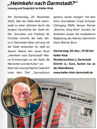 Donnerstag, 20.11.2025, 19.30 Uhr Darmstädter Keller Klub e.V., Residenzschloss 1 64283 Darmstadt Der Keller-Klub lädt am Donnerstag, 20. November, ab 19.30 Uhr zu einer Zeitreise durch Darmstadts jüngste Vergangenheit ein. Der lange Jahre in Darmstadt lebende und auf vielfache Weise mit dieser Stadt verbundene Journalist und Publizist W. Christian Schmitt (Jahrgang 1944) präsentiert an diesem Abend sein Buch „Heimkehr nach Darmstadt? Meine Erinnerungen an die Stadt, die Menschen und die Kultur“, gefolgt von einem Gespräch zum Thema „Journalismus gestern, heute, morgen“ mit Echo-Journalist Frank Schuster (Jahrgang 1969), dessen unlängst erschienener Roman „Büchner Sixty-Nine“ für Gesprächsstoff sorgte.