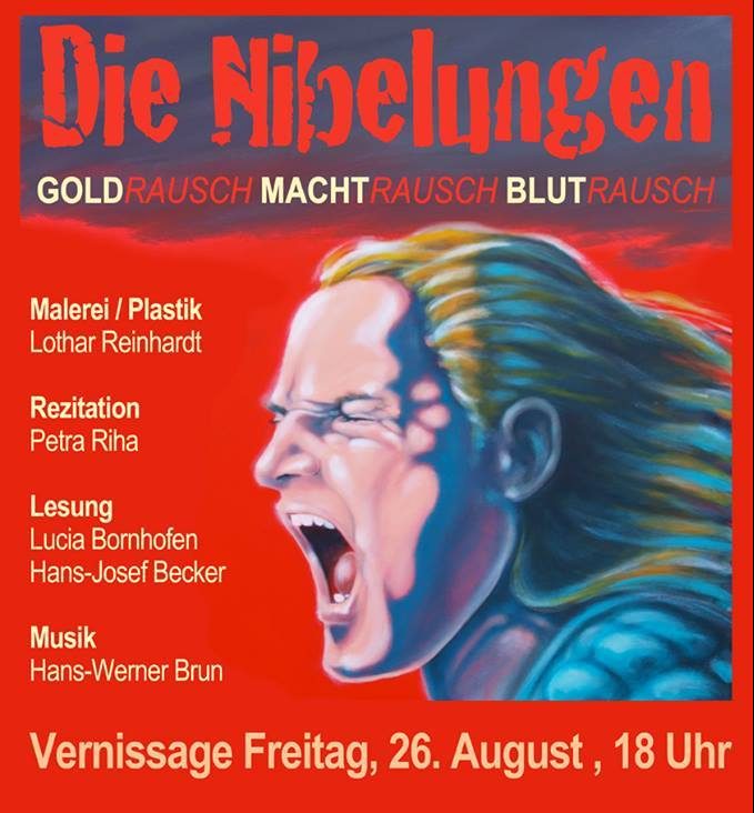 Rot – die Farbe des Blutes, des Weins und des Feuers. Ihre Bedeutungsvielfalt reicht von Liebe und Leidenschaft bis Hass und Gewalt. All dies findet man im Nibelungen-Epos, einem Stück Weltliteratur, das mit zahlreichen Orten unserer Region verwoben ist. Viele heutige Erzählformen des Theaters, des Films, der Computeranimation und des Comics sind undenkbar ohne unsere uralten Mythen und Legenden. Der Künstler Lothar Reinhardt hat ihre drastische Sicht auf die Welt in kraftvolle Gemälde und Objekte umgesetzt.