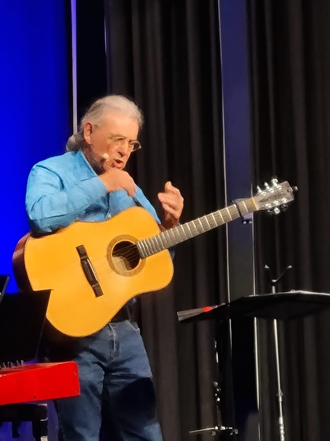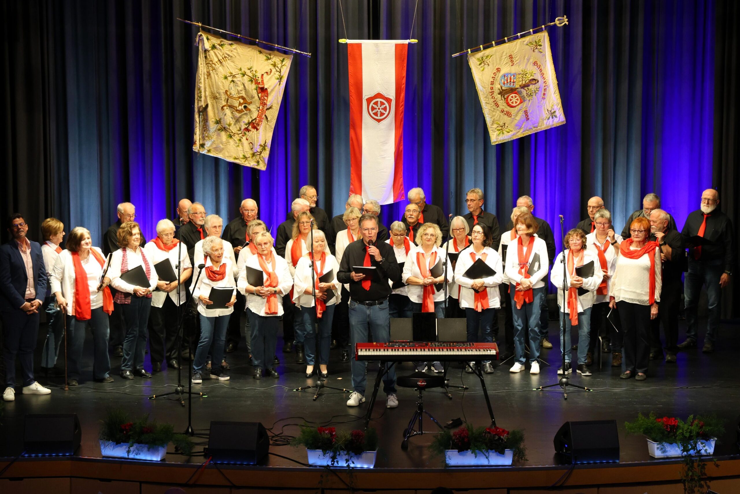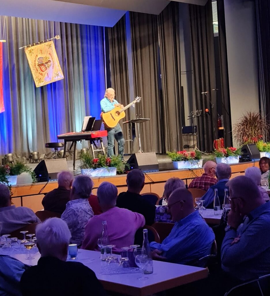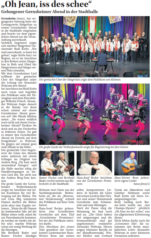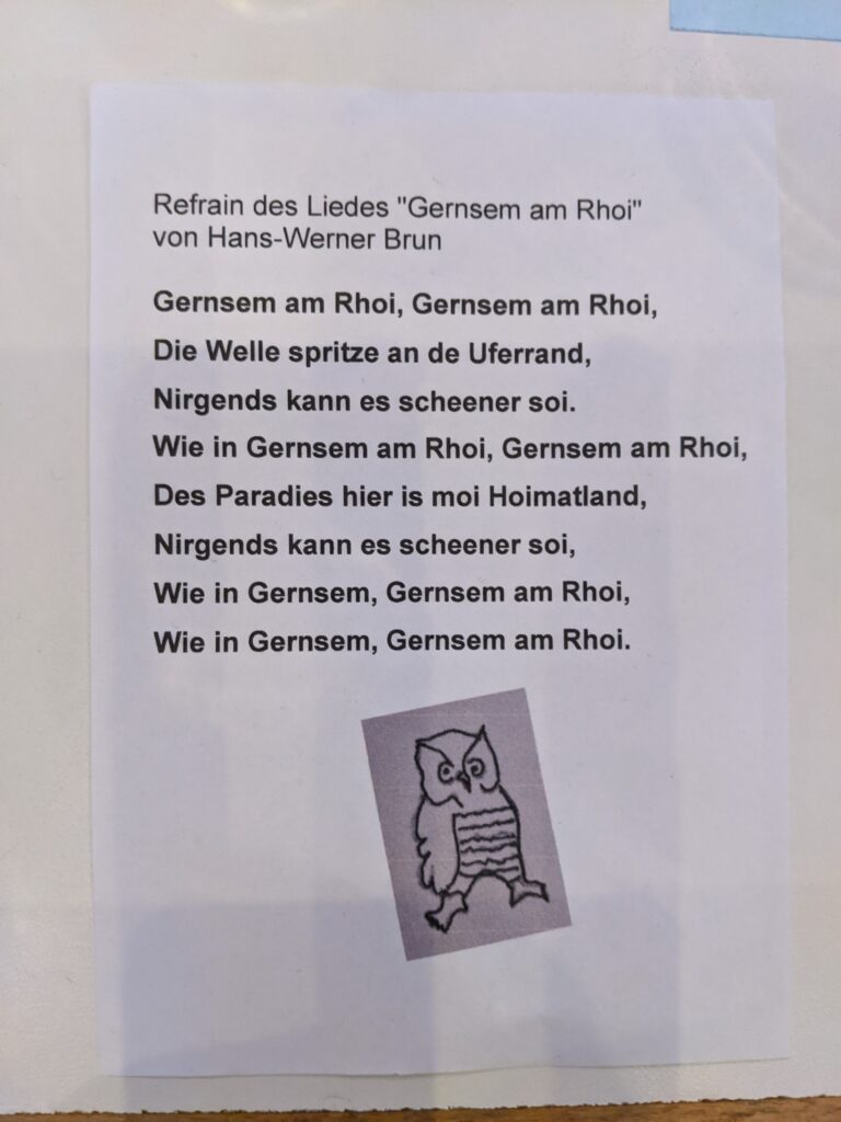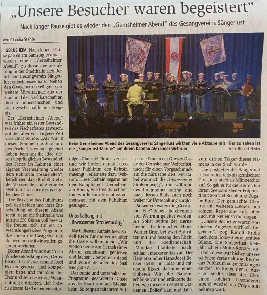 Für mich war es ein ganz besonderer Abend wieder einmal in meiner Heimatstadt auf der Bühne der Stadthalle mit meinen, vorallem Gernsheimer Liedern, auftreten zu dürfen. Auf den Tischen lag der Refrain meines Liedes „Gernsem am Rhoi“ und die vielen Zuhörer*innen haben mich dann bei dem Lied kräftig unterstützt. Große Freude!