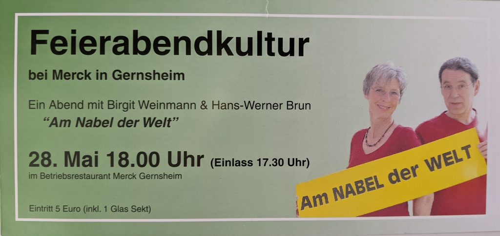„Sie sind der Ansicht, das Ried sei keine Reise wert? Dann sollten Sie unbedingt die Touristikmanager von „Ried-Reise-Genuss-Pur“, Beatrice und Jean Guitar (Birgit Weinmann und Hans-Werner Brun) kontaktieren. Die in Gernsheim ansässigen Fans kurzweiliger Kultur haben für Besucher, die endlich den zwischen Bibliser Atomkraftwerk und Goddelauer Büchnerhaus gelegenen „Nabel der Welt“ kennen lernen wollen, eine genussreiche Rundreise mit allerhand schneidigen Programmpunkten auf die Beine gestellt… „Wir haben die positiven Schwingungen des Unscheinbaren herausgearbeitet“, erfuhr das amüsierte Publikum, das dem Reise-Ideen-Potpourri der nicht nur im Ried bekannten Bühnenakteure Birgit Weinmann und Hans-Werner Brun reichlich anerkennenden Applaus zollte. Mit ihrem Programm „Am Nabel der Welt“ sangen sie – und das im wahrsten Sinne des Wortes – ein Loblied auf ihr Heimatland, das die beiden zum „kloane Paradies“ erklärten.“