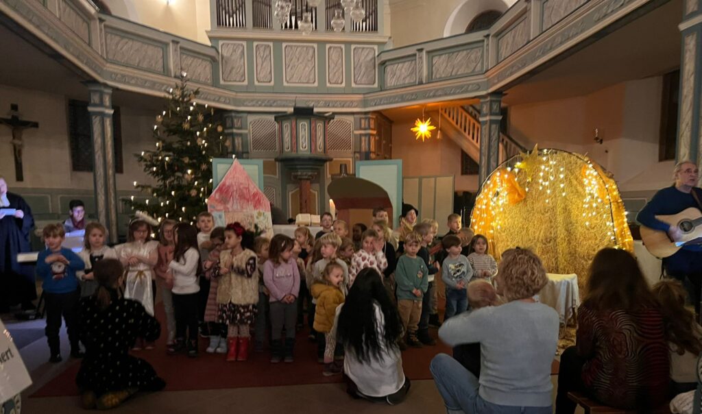 Es war ein tolles Programm, dass die Kinder des evang. Kindergartens Biebesheim am Mittwoch, 17.12.2025 in der evang. Kirche zur Aufführung brachten. Die Gestaltung des Gottesdienstes übernahmen die Schulanfänger und die Erzieherinnen, sowie Pfarrerin Siebers und die Kirchenkantorin Frau Streit. Ich hatte die Freude mit den Kindern während des Gottesdienstes das Lied: „Weihnachten ist Party für Jesus“ zu singen. Tatkräftig wurden wird dabei nochmal am Ende des Gottesdienstes von den Eltern, Großeltern Geschwistern und Freunden unterstützt. Das hat richtig Spaß gemacht.