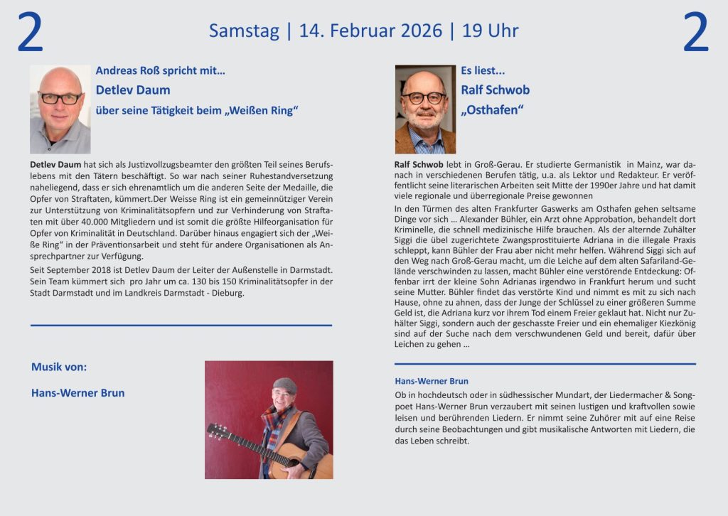 Samstag, 14. Februar 2026, 19.00 Uhr, Stadtkirche Darmstadt, An der Stadtkirche 1 64283 Darmstadt Andreas Roß spricht mit Detlev Daum über seine Tätigkeit beim „Weißen Ring“. Es liest Ralf Schwob aus seinem Buch „Osthafen“. Musikalisch begleitet wird die Veranstaltung vom Liedermacher & Songpoeten Hans-Werner Brun.