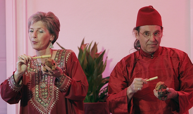 „…Birgit Weinmann und Hans-Werner Brun hatten…in die Zauberwelt der Märchen entführt. Wetterbedingt fand die Veranstaltung nicht im Hof des Schöfferhauses unter den alten Kastanien, sondern im vollbesetzten Innenraum statt, wo die beiden Akteure die Lacher auf ihrer Seite hatten.“