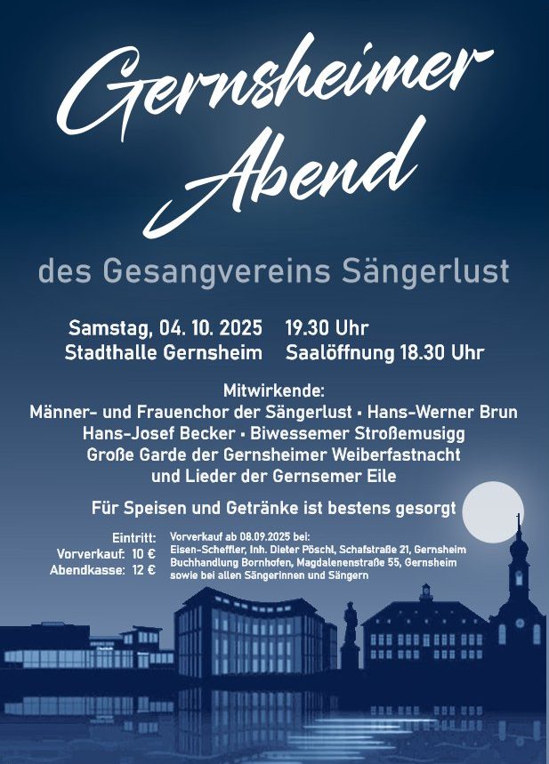 Der Gernsheimer Gesangverein lädt in die Stadthalle zum Gernsheimer Abend ein. Geboten wird ein buntes Programm mit dem Männer- und Frauenchor des Sängerlust, mit Hans-Josef Becker mit einer Gernsheimer Geschichte, mit der großen Garde der Gernsheimer Weiberfastnacht, mit der Biwessemer Stroßemusigg, mit den Liedern der Gernsemer Eile und den Liedern des Liedermachers & Songpoeten Hans-Werner Brun.