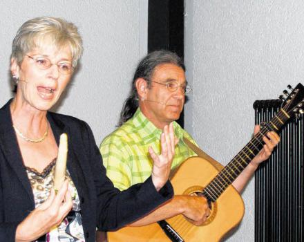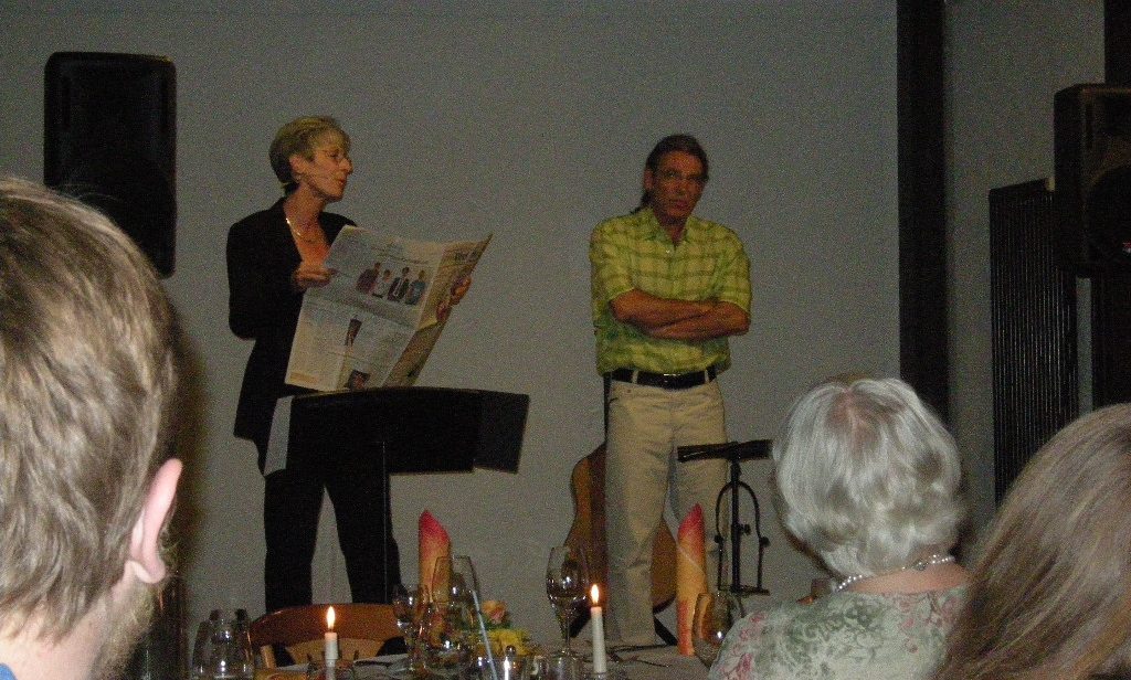 „… Hans Werner Brun und Birgit Weinmann kredenzten Frühlingslyrik und freche Lieder zum königlichen Gemüse… Nicht, dass solch ein Mahl an sich langweilig werden könnte, doch zwischen den Gängen bekamen die Gäste auch ein kurzweiliges Bühnenprogramm geboten. Während das Essen in den vergangenen beiden Jahren von Kabarettisten begleitet wurde, versuchten die Veranstalter dieses Mal etwas Neues: Der Gernsheimer Liedermacher Hans Werner Brun und seine Kollegin Birgit Weinmann führten ein literarisch-musikalisches Programm mit dem Titel „Frühlingsgefühle“ auf… Statt eines hochtrabend-intellektualisierenden Bildungsprogramms lieferten die beiden jedoch ein buntes Frühlings-Bouquet, in dem expressionistische Lyrik von Lichtenstein problemlos neben anzügliche Scherze und eine Ode an Schnitzel passte…