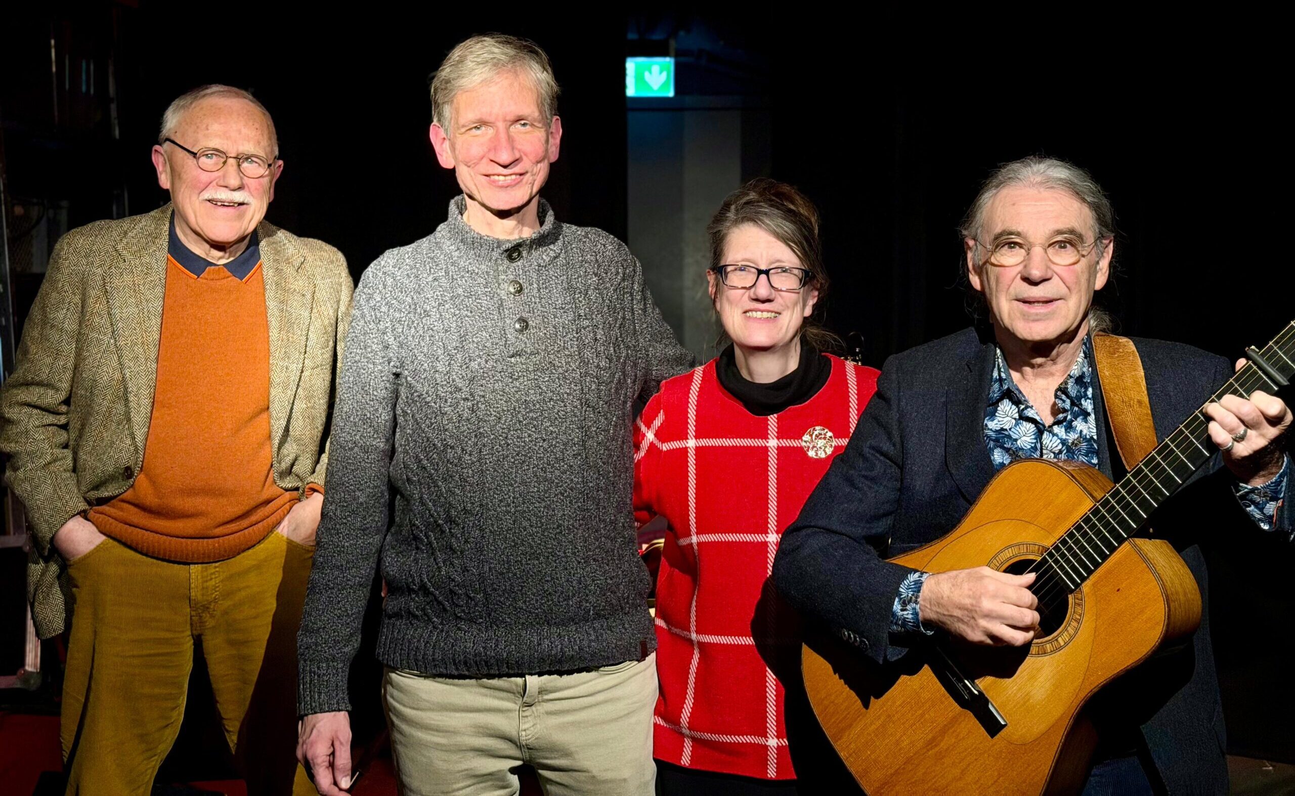 „Der Abend hat Spaß gemacht“, so Frank Schuster (2. v. li.) zur Veranstaltung im Darmstädter Künstlerkeller, bei der er mit W. Christian Schmitt (l.) über „Journalismus gestern, heute, morgen“ diskutierte. Doch zunächst ging es um die Lesung aus Schmitts neuem Buch „Heimkehr nach Darmstadt? Meine Erinnerungen an die Stadt, die Menschen und die Kultur“… Organisiert hatte die Veranstaltung Judith Kautz (2.v.r.), Buchhändlerin und Vorstands-Mitglied des Keller-Klubs, die den Abend so resümierte: „Wir sehen alle sehr zufrieden aus“. Für die musikalische Begleitung sorgte Hans-Werner Brun (r.).